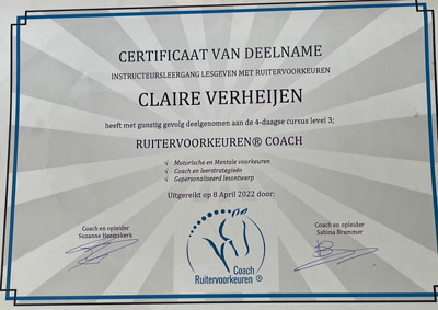 Na het behalen van level 3 mag zij zich nu Ruitervoorkeuren coach noemen.